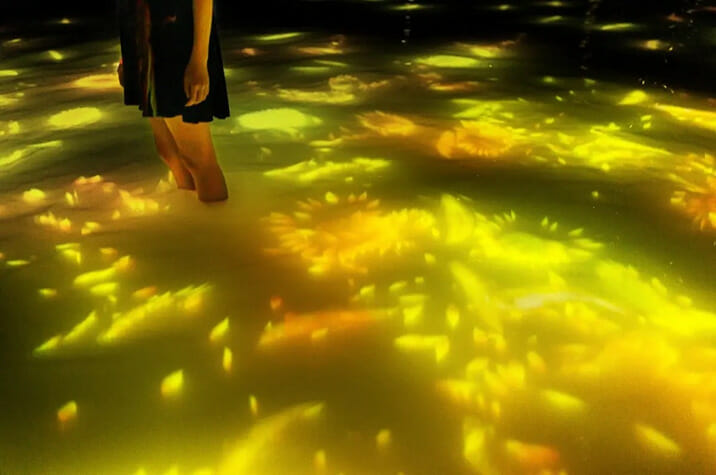 ミュージアム内の作品「人と共に踊る鯉によって描かれる水面のドローイング – Infinity」が、7月1日(土)から7月31日(月)までの期間限定でひまわりが広がる空間に変化します。