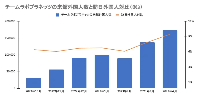 ※3:日本政府観光局(JNTO)が毎月発表している訪日外客統計の訪日外客数推計値とチームラボプラネッツの来場外国人数を比較して算出。
