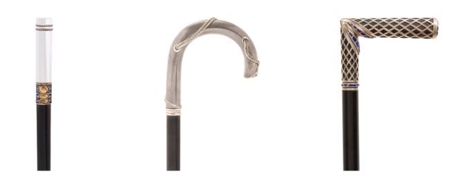 銀の蛇: ロシア皇室御用達ジュエラーとして名高いメゾン・ボリン(House of Bolin)による、スウェーデン製のダイヤモンド・インセット・シルバー・ニエロ・スネーク・ステッキ(1919年頃)。ハンドルには、古来より知恵と永遠の再生を象徴する蛇がデザインに絡みつくように配されており、精巧なニエロ(黒金)細工とダイヤモンドのアクセントで表現されている。(予想落札価格:5,000 – 8,000米ドル)
